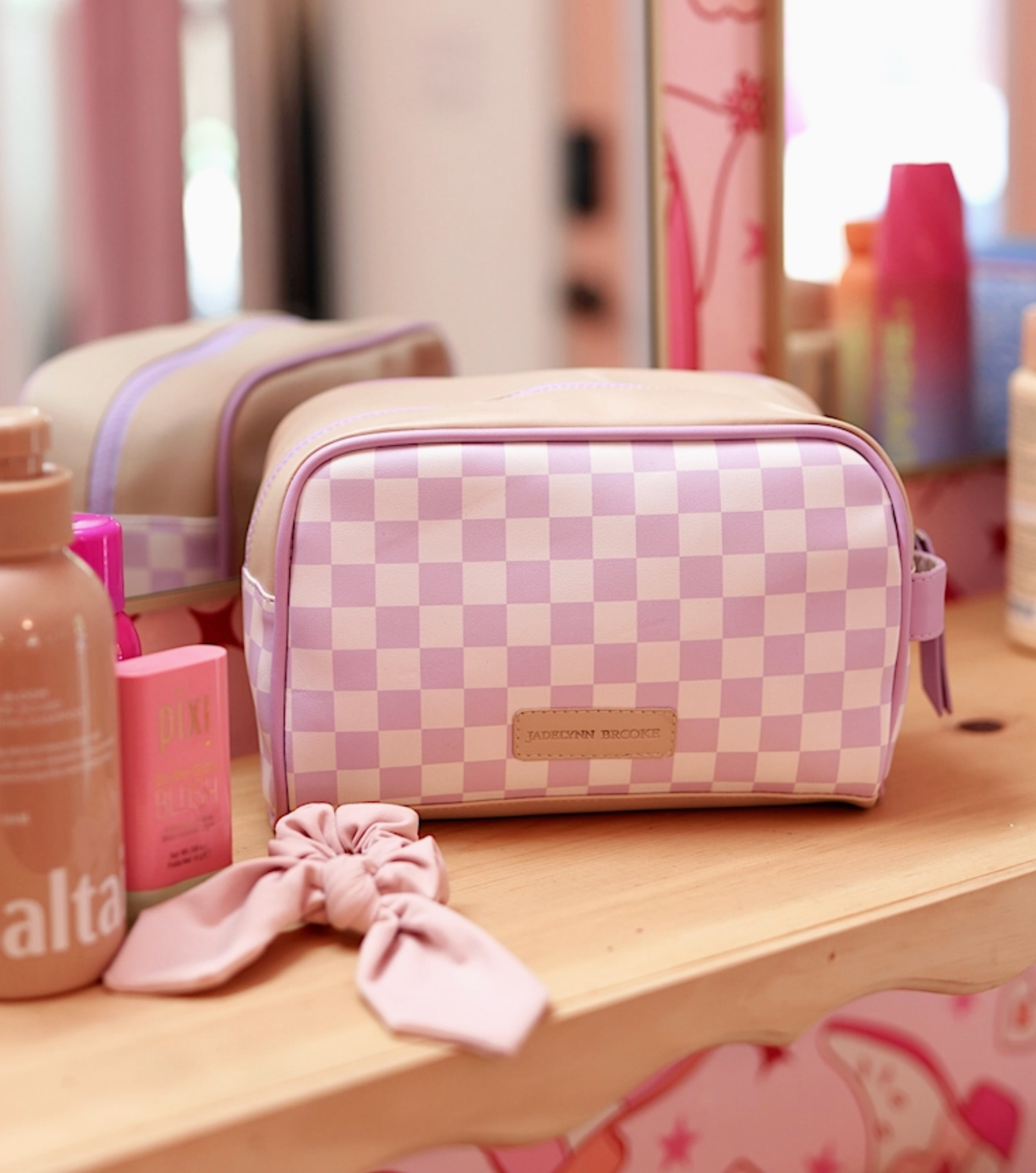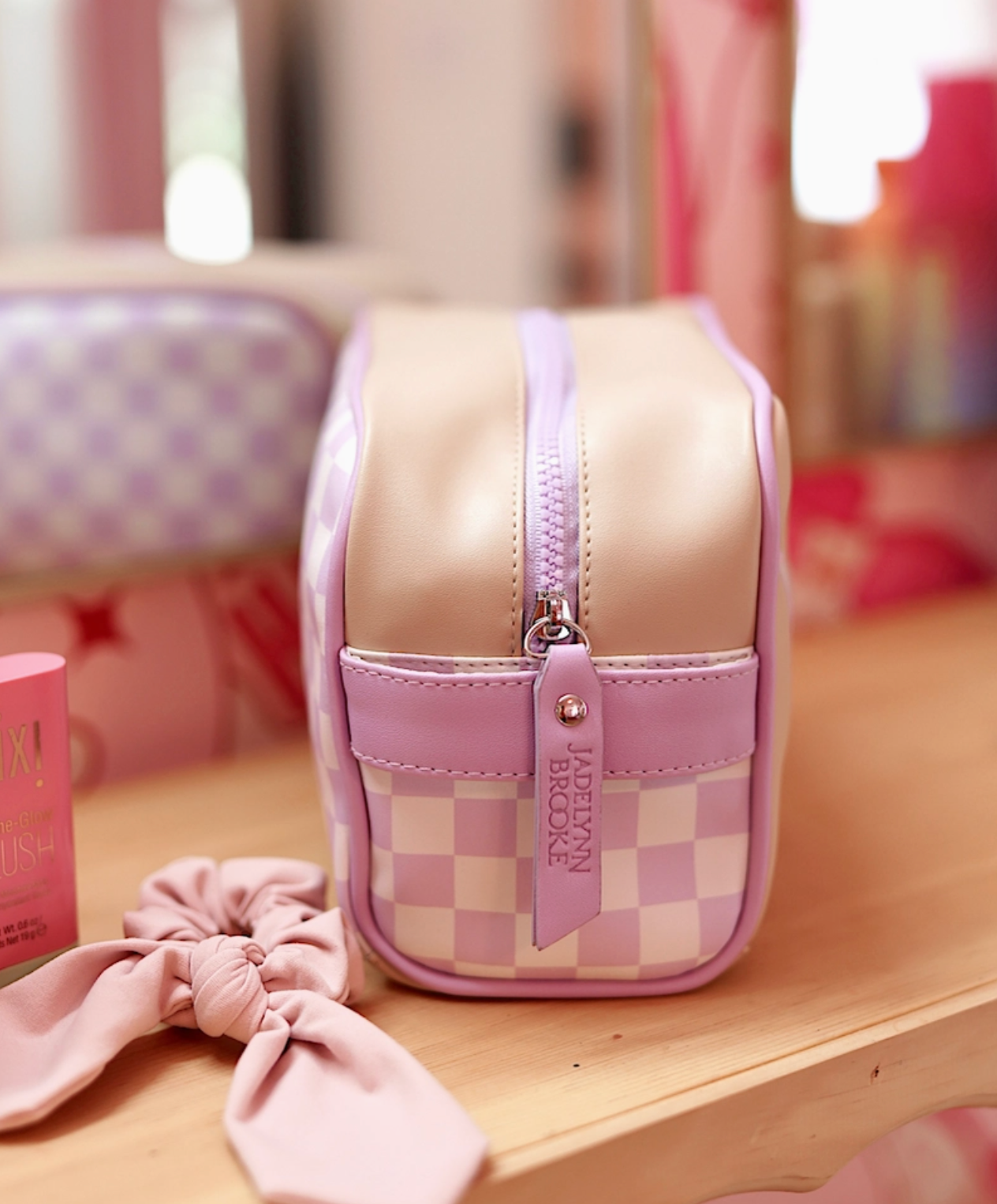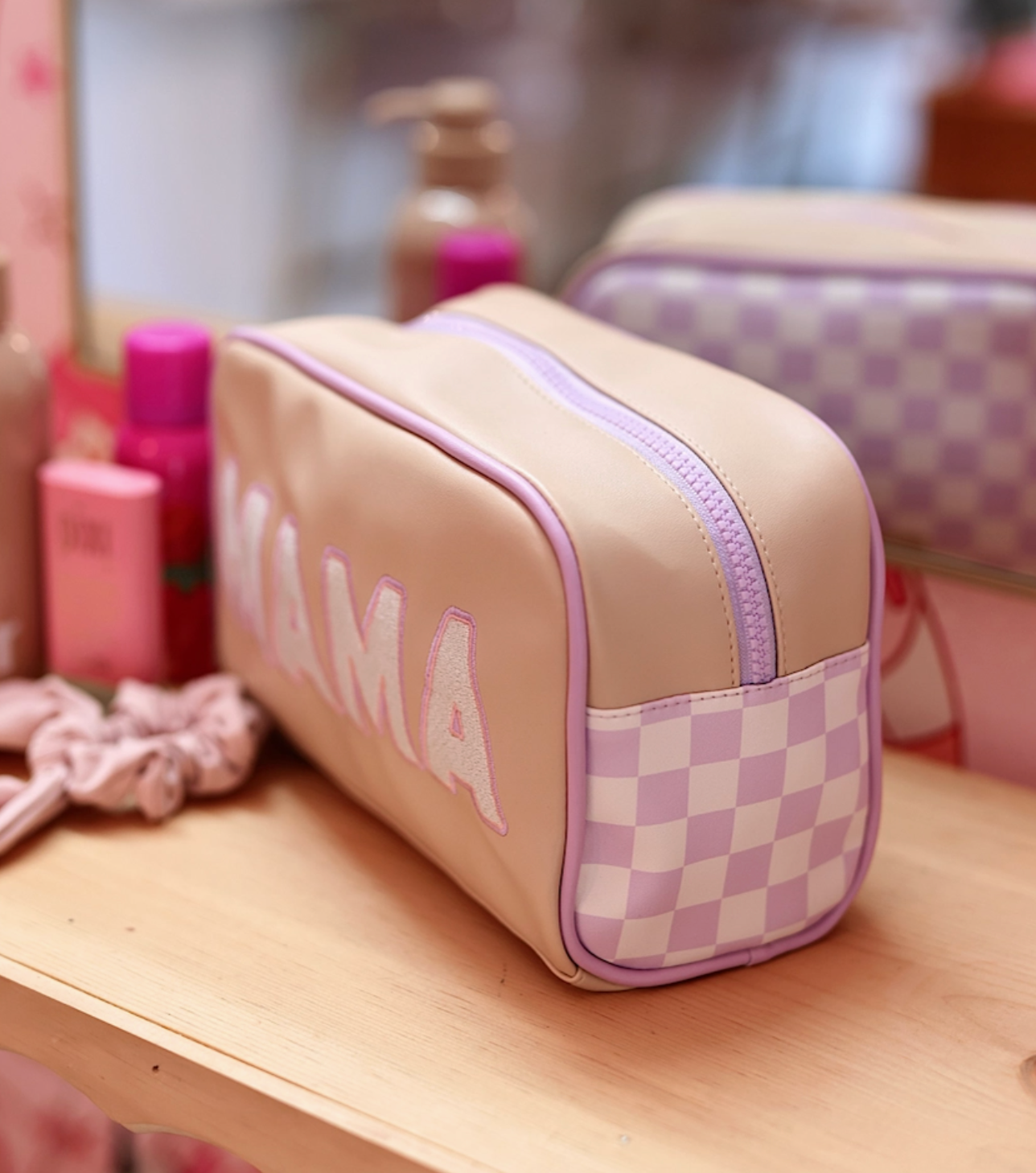 Our Handle Cosmetic Bags feature a secure zippered top opening and a convenient handle on one end—perfect for travel or daily use. Each bag is beautifully finished with embroidered lettering on the side, adding a fun, personal touch. Great for organizing makeup, skincare, baby supplies and all kinds of STUFF!