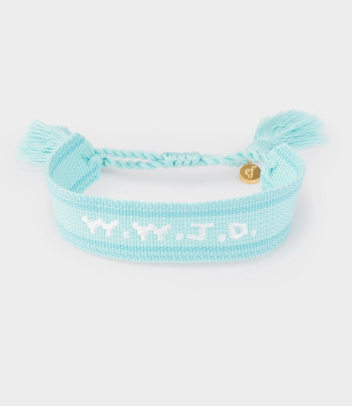 A classic question. A daily reminder. This teal WWJD woven bracelet keeps it simple: What Would Jesus Do? Wear it as a statement of faith and a reminder to live with purpose, compassion, and grace wherever you go. Made adjustable with a soft braided tie and finished with a gold EF logo charm.