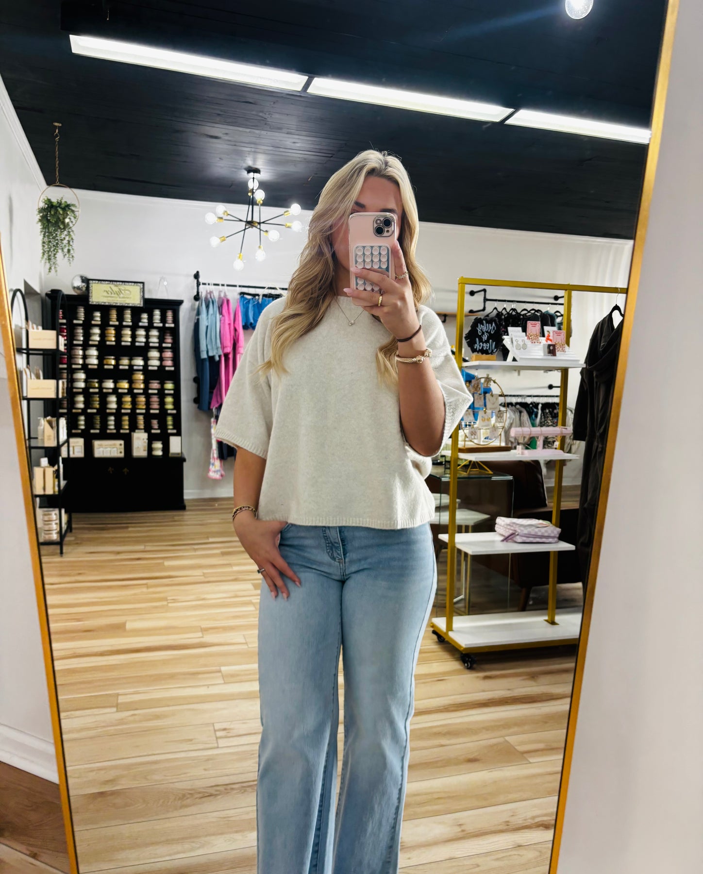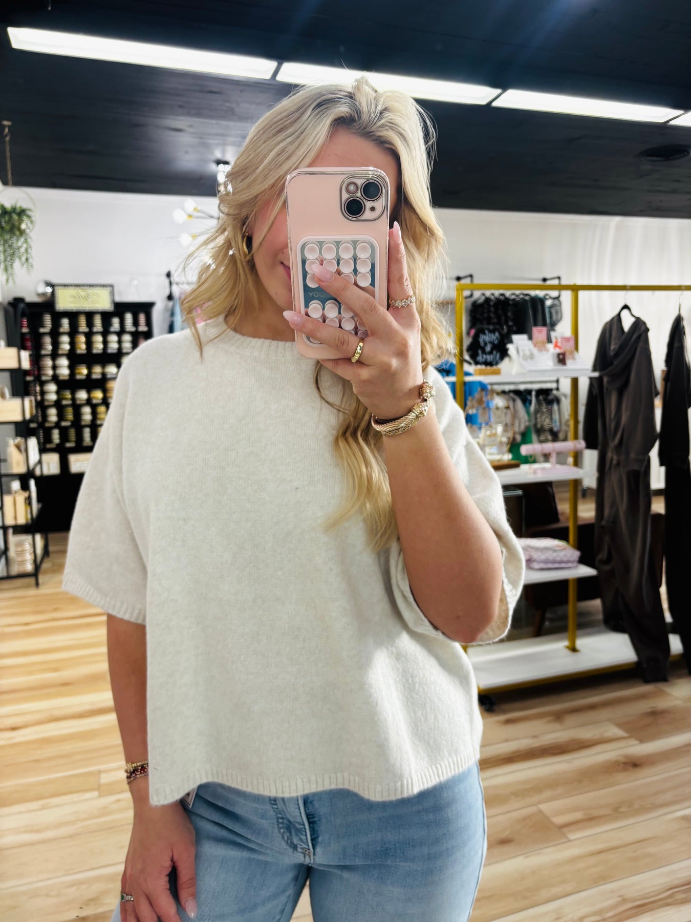 Effortlessly chic and undeniably comfortable, this cream boxy sweater top delivers relaxed sophistication for any season. The short sleeves and crew neckline create a timeless silhouette that flatters every frame, while the generous boxy fit ensures all-day ease without sacrificing style. Perfect for layering or wearing solo, this versatile piece transitions seamlessly from casual weekends to elevated everyday looks. Crafted for those who refuse to compromise between comfort and fashion, it's the wardrobe essential you'll reach for again and again.